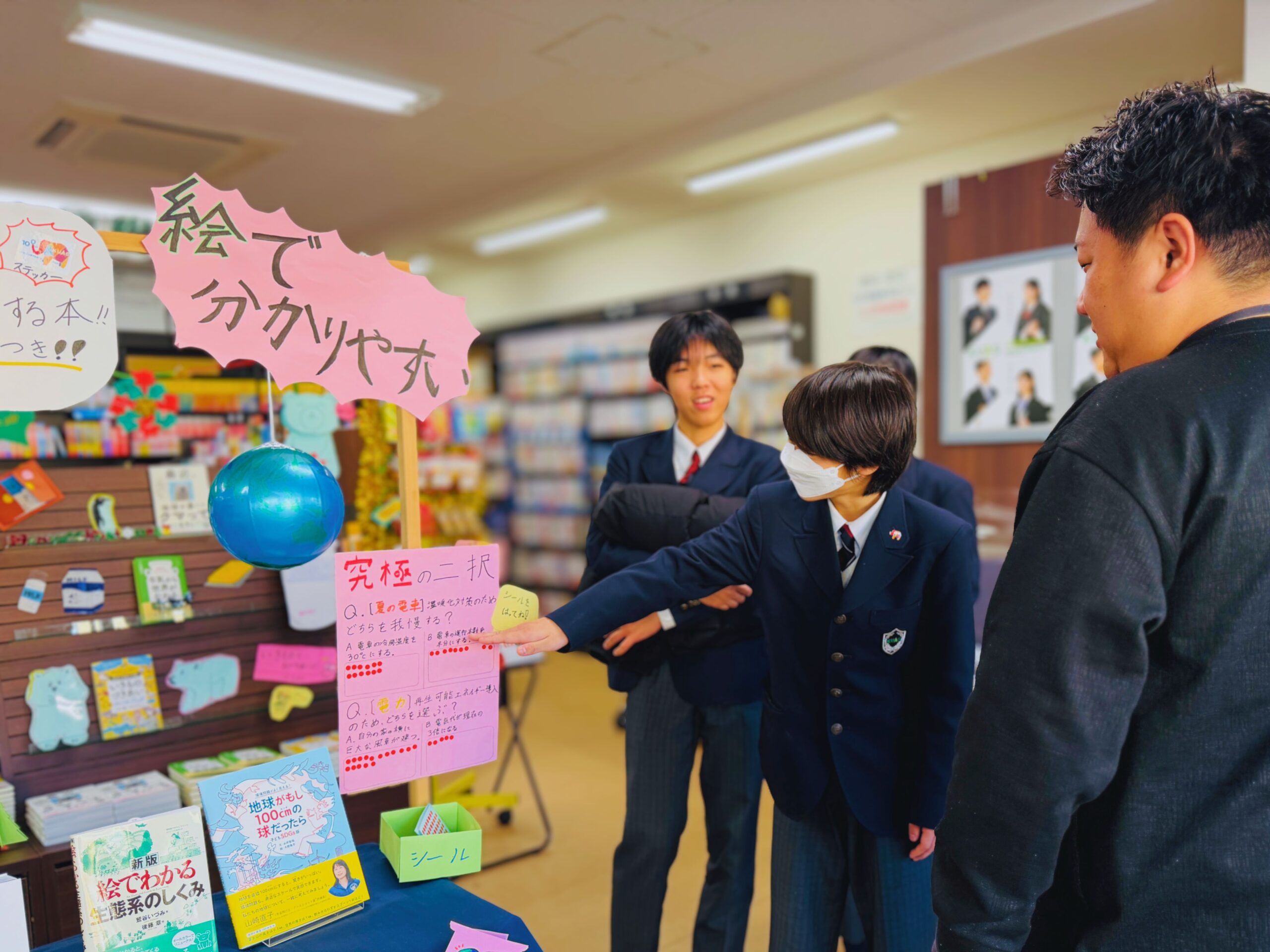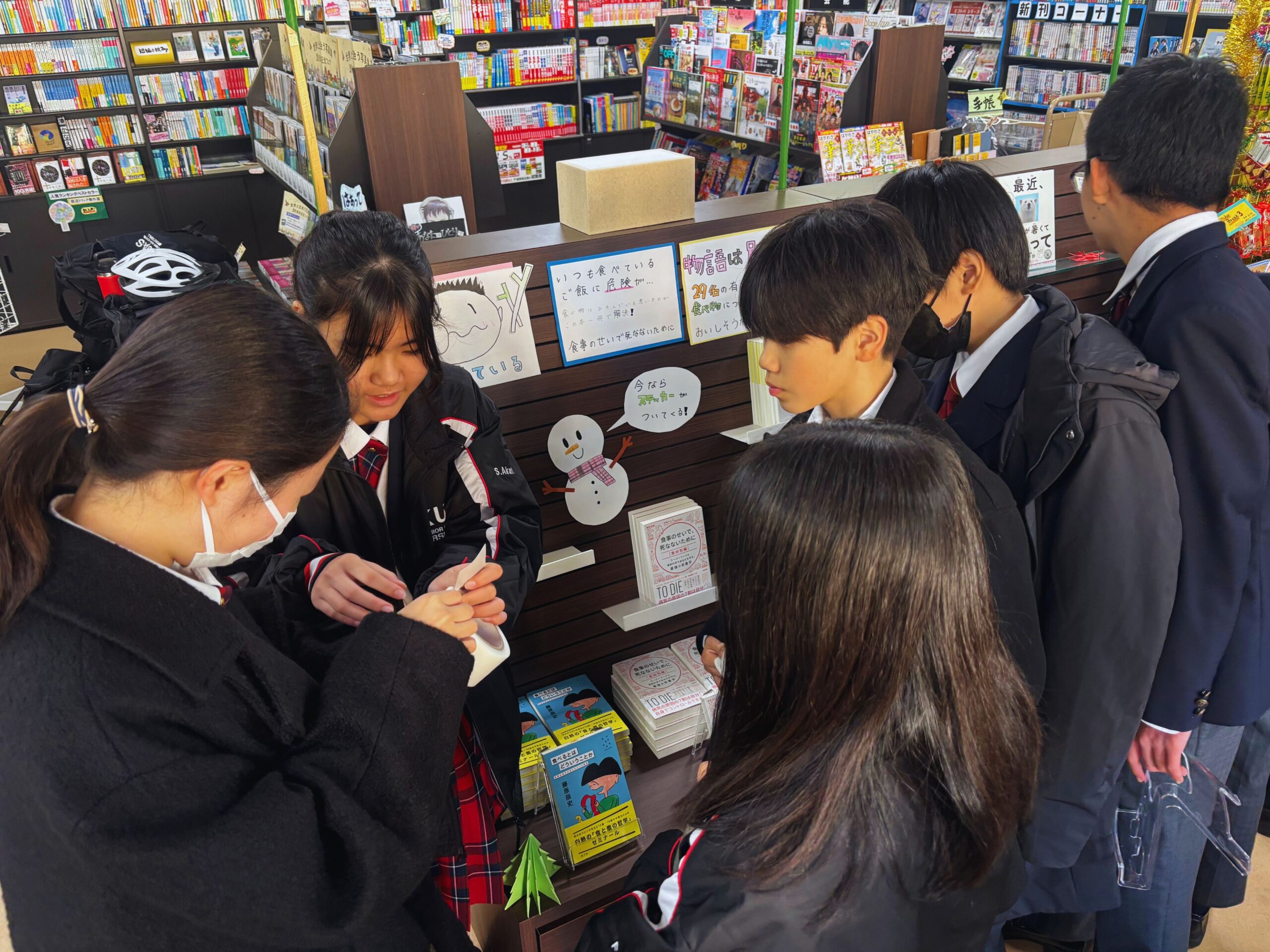 校内での丸善プロジェクト企画書大会にて「最優秀賞」を受賞をしたチームの生徒による書店での販売を行いました。