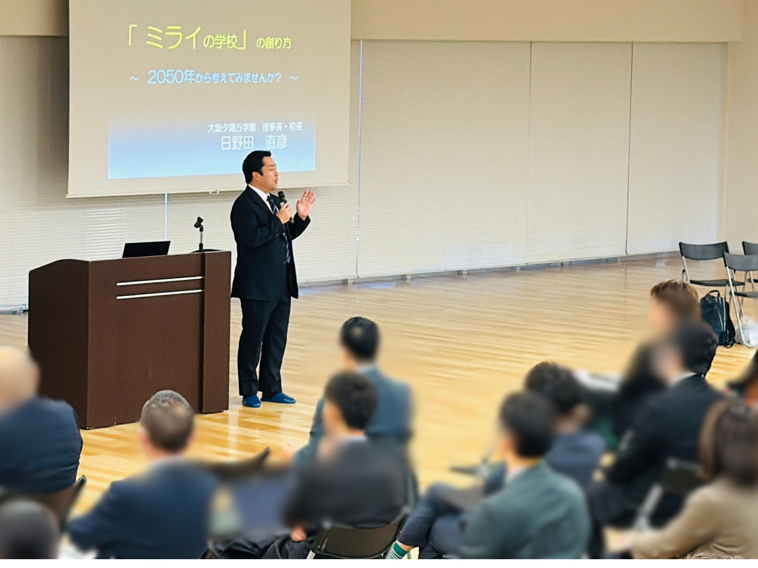 基調講演では、大阪夕陽丘学園理事長・校長の日野田 直彦先生をお招きし、『「ミライの学校」の創り方 ~2050年から考えてみませんか?~』についてご講演いただきました。