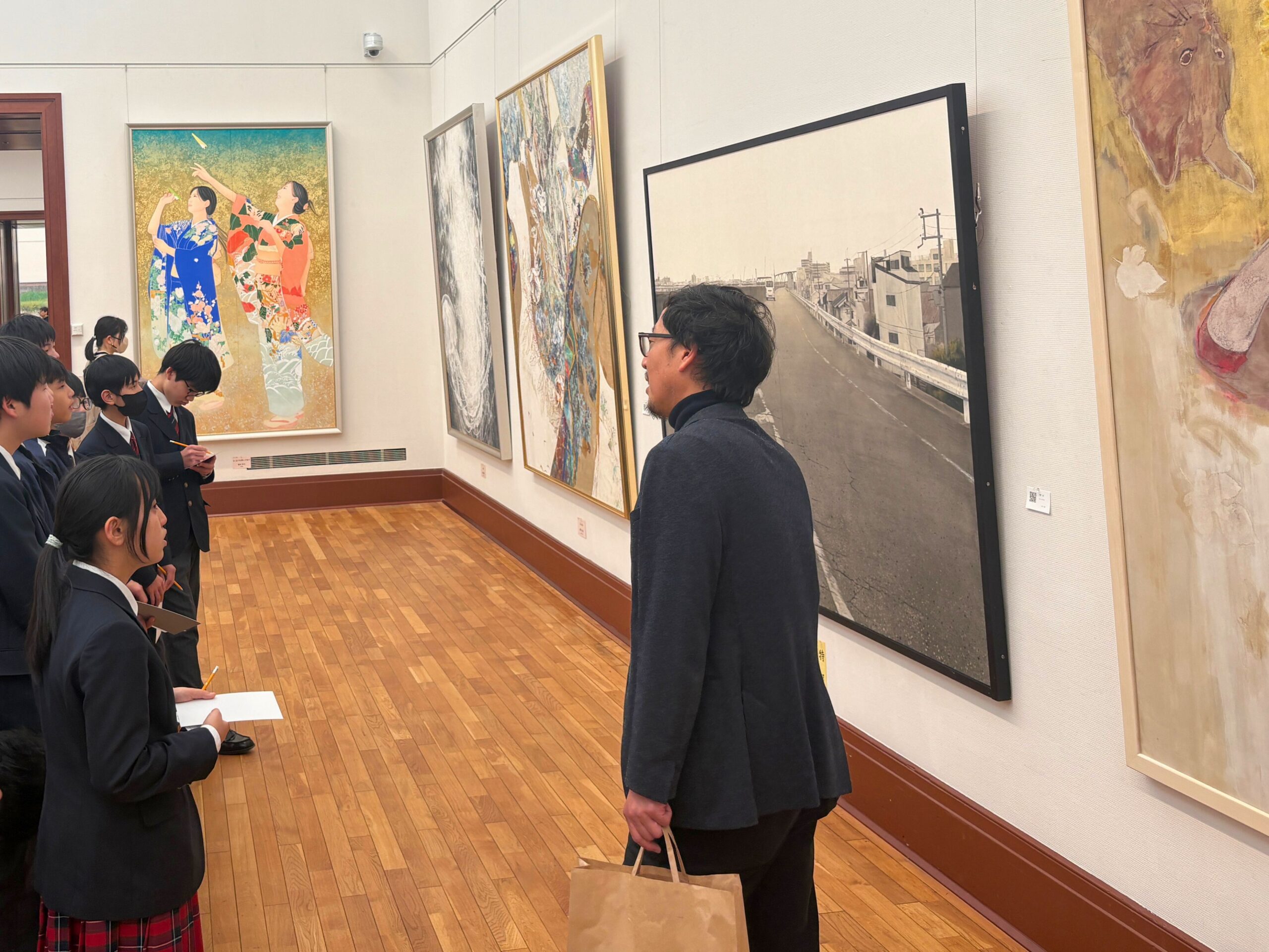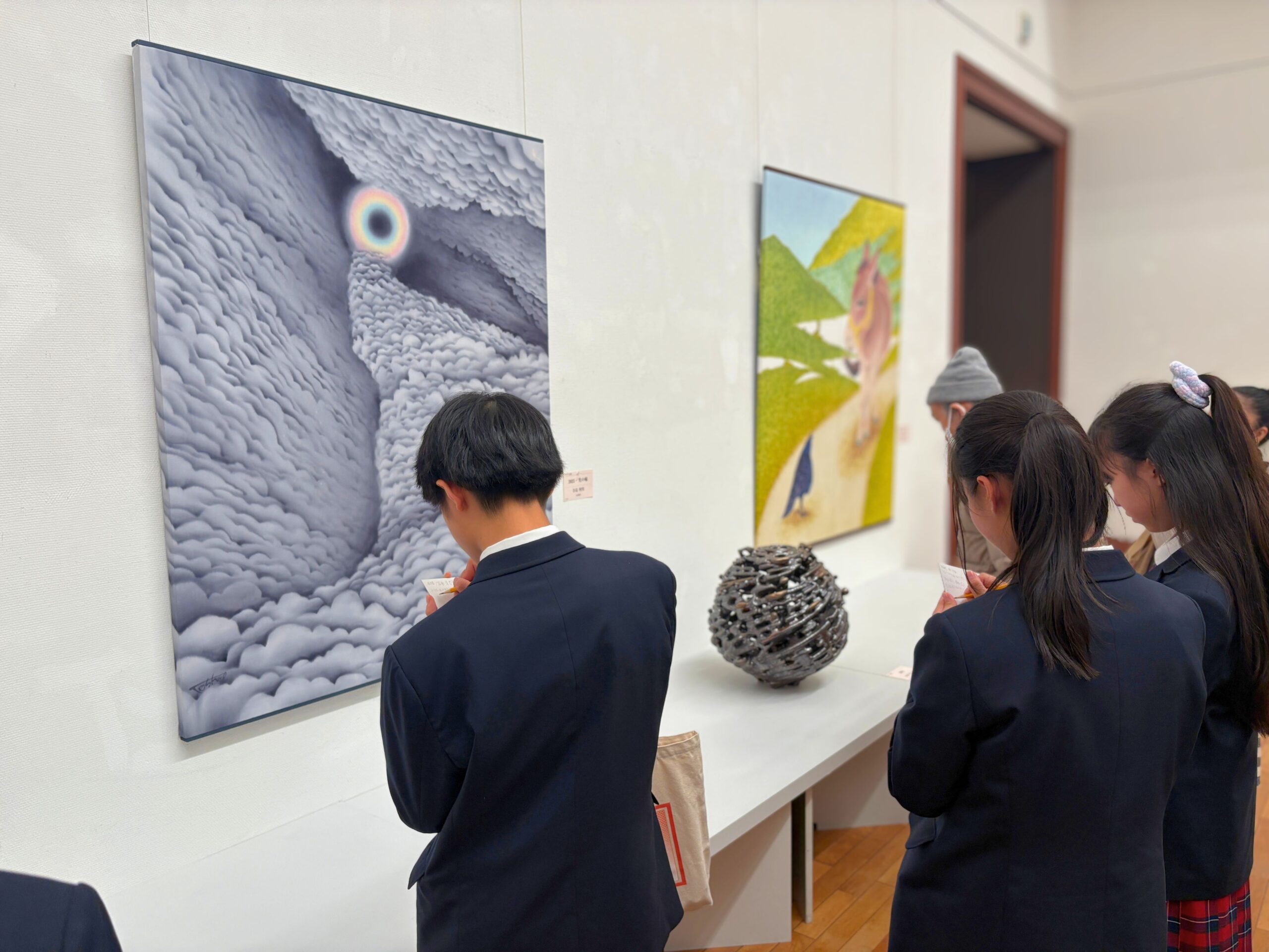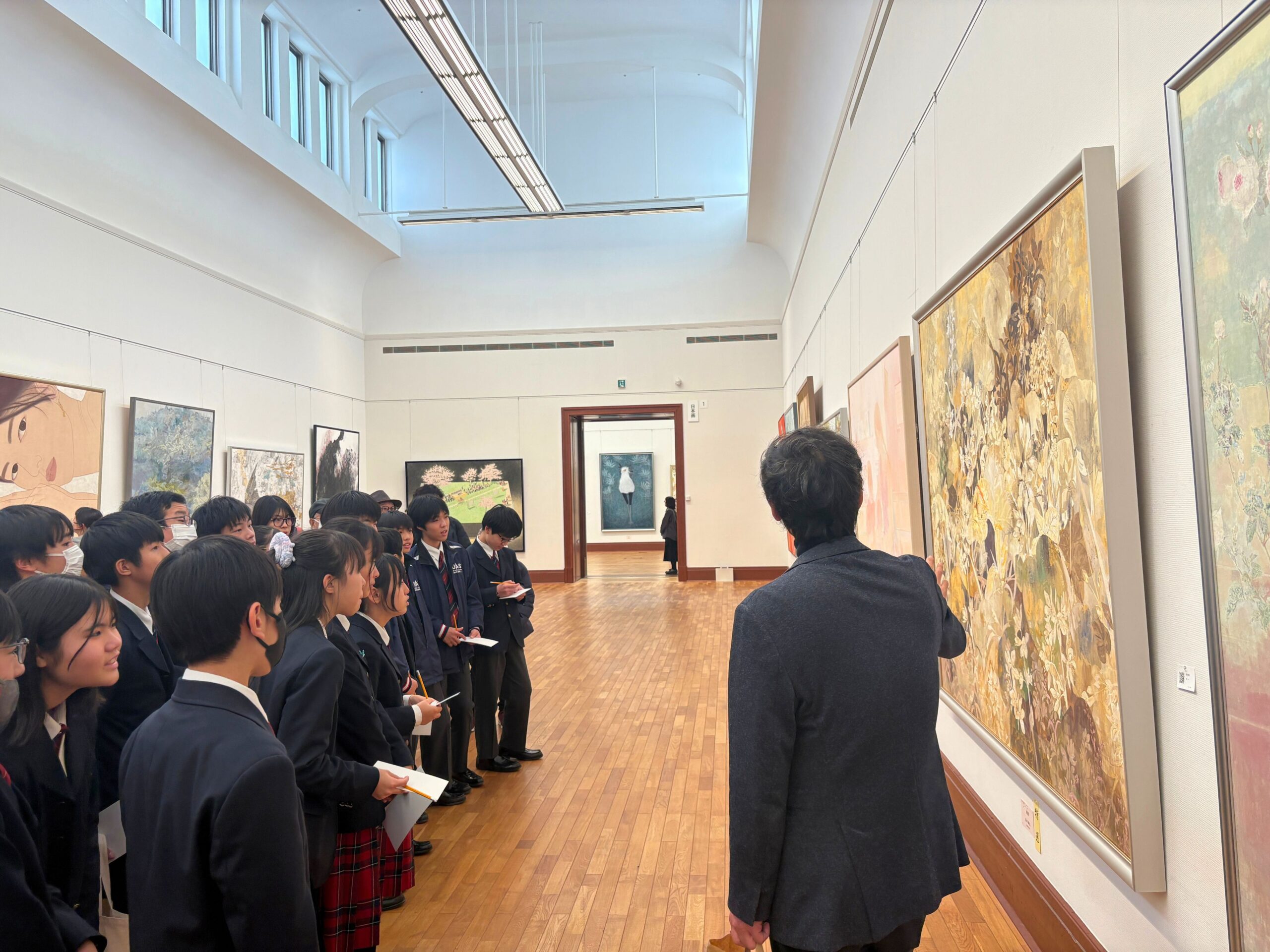 作品を出展している本校美術教諭の米田先生の案内で鑑賞をしました。