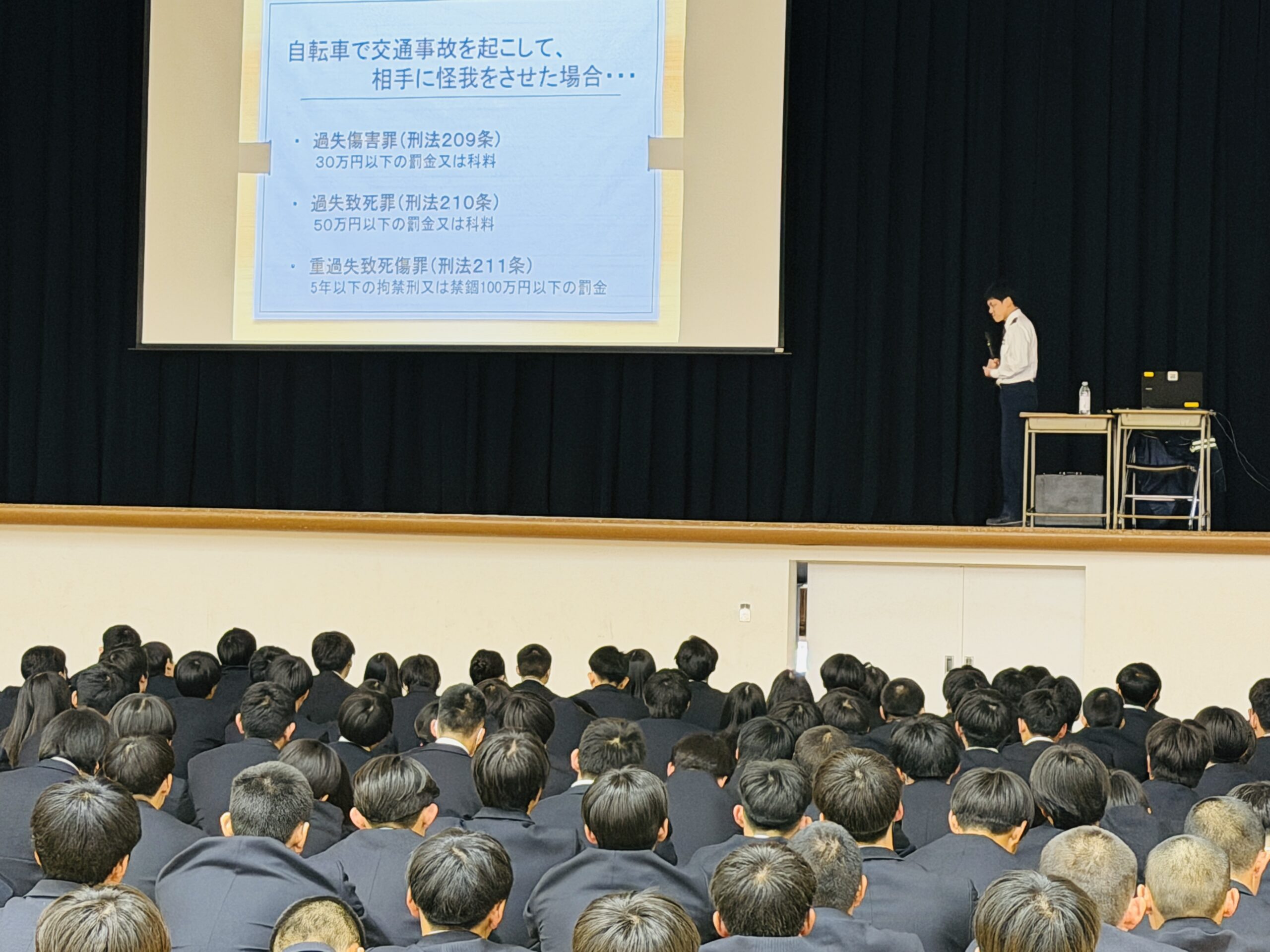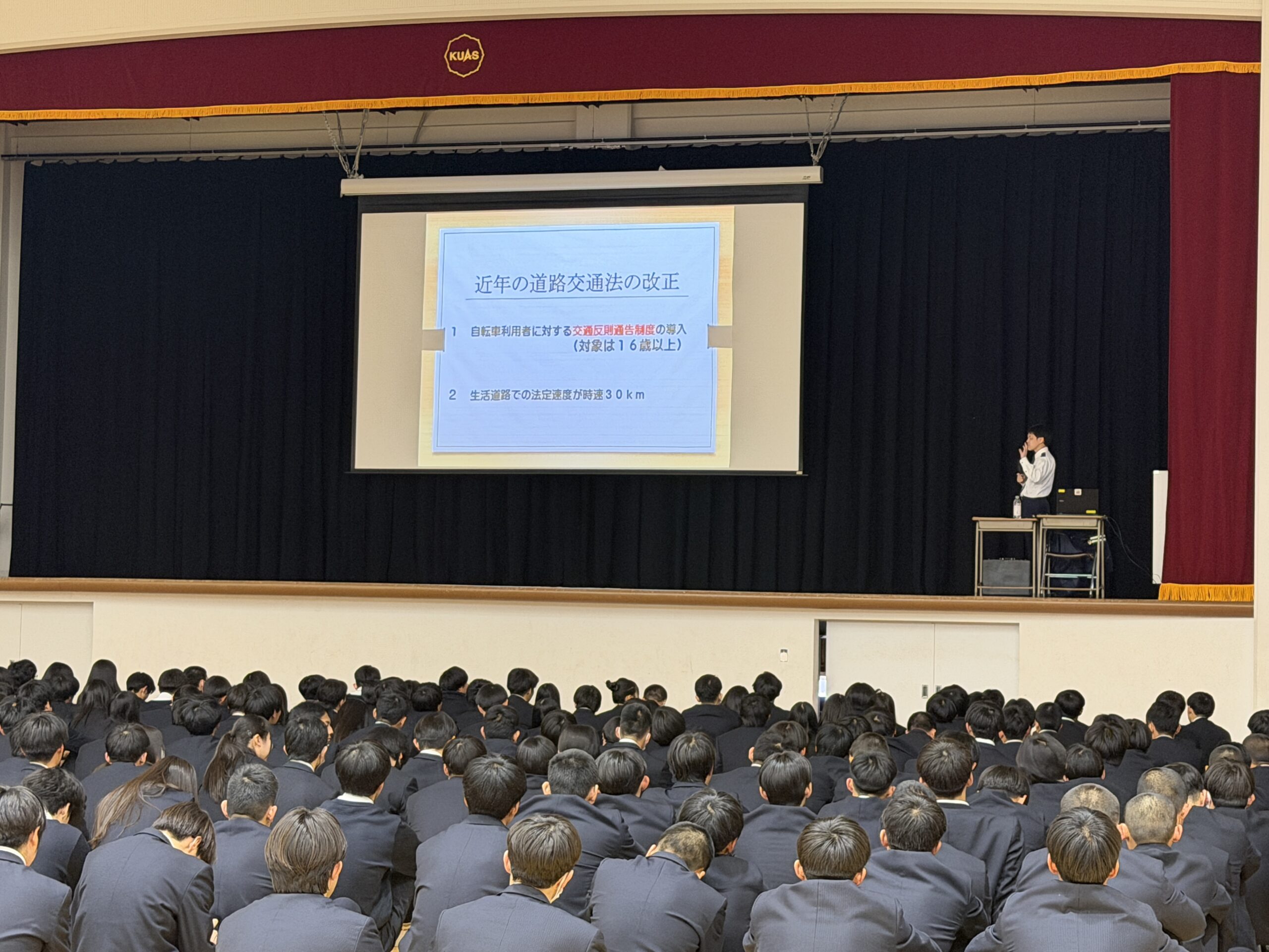 2月18日(水)に、右京警察署交通課の方をお招きし、高校2年生を対象に安全講習を行いました。 講演の中では、交通事故の統計を始め、近年の道路交通法改正についてや基本的な交通ルールのおさらいについてお話をいただきました。2026年4月からは16歳以上の運転者に対し、交通違反に反則金(青切符)が適用されます。 本日の講演会の内容をしっかりと胸に刻み、危機意識をもって日々の生活を送っていきましょう。 右京警察署のみなさま、ありがとうございました。