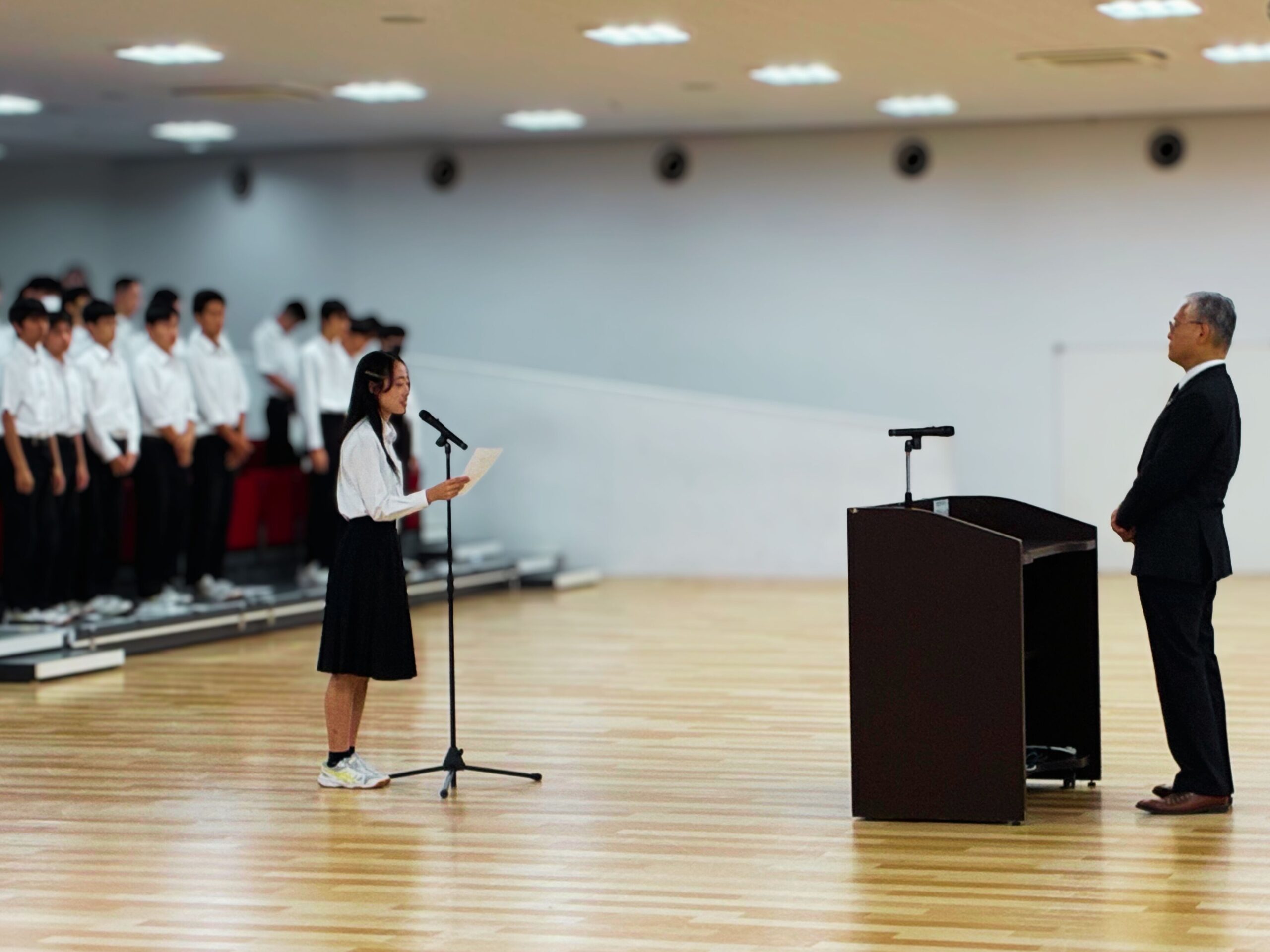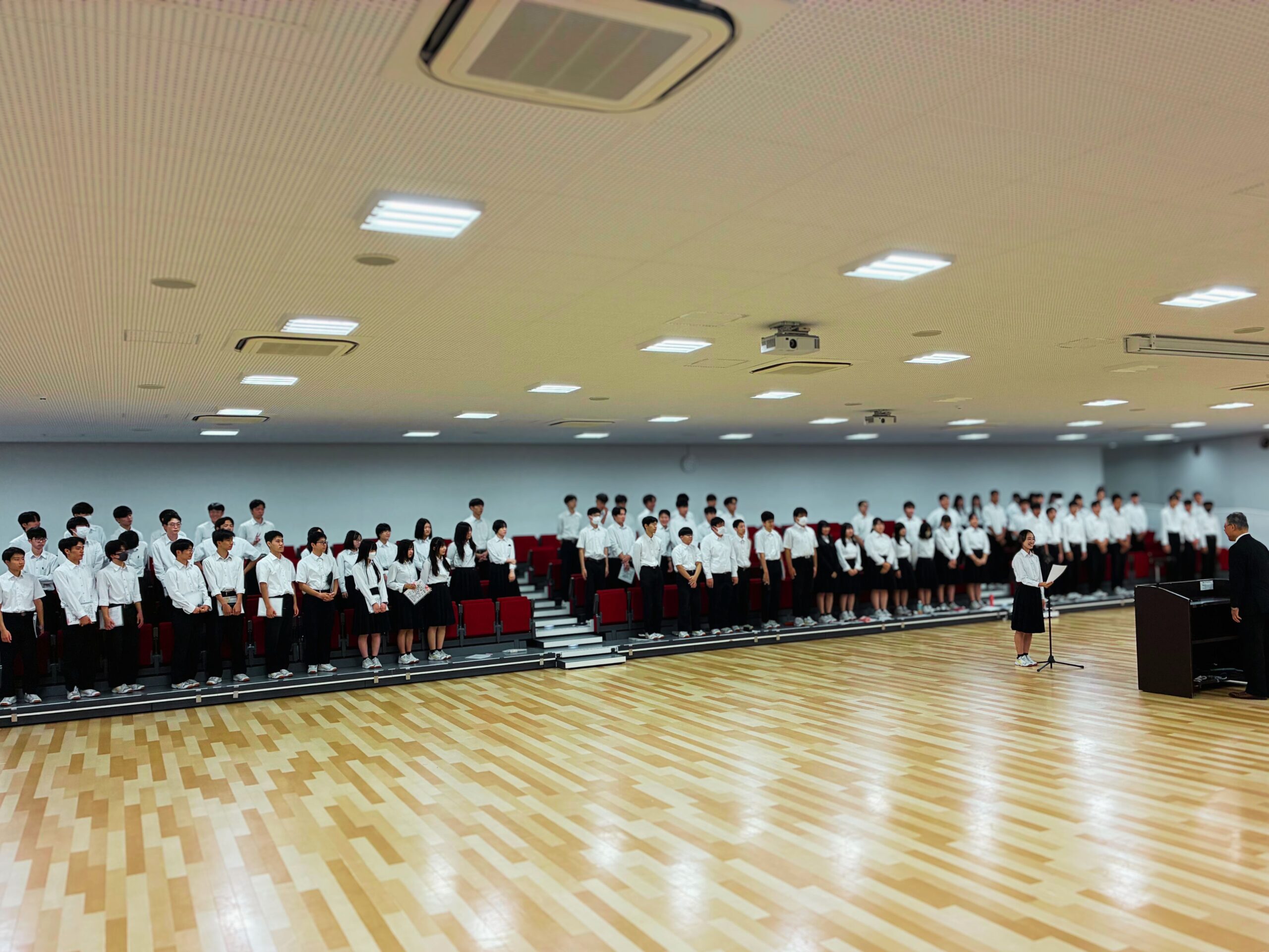 結団式では、校長先生からの激励から始まり、団長の橋本千佳先生、第2学年部長の黒田先生からのイギリス研修に向けたお話があり、生徒代表として、団長の稲田さんによる決意表明がありました。