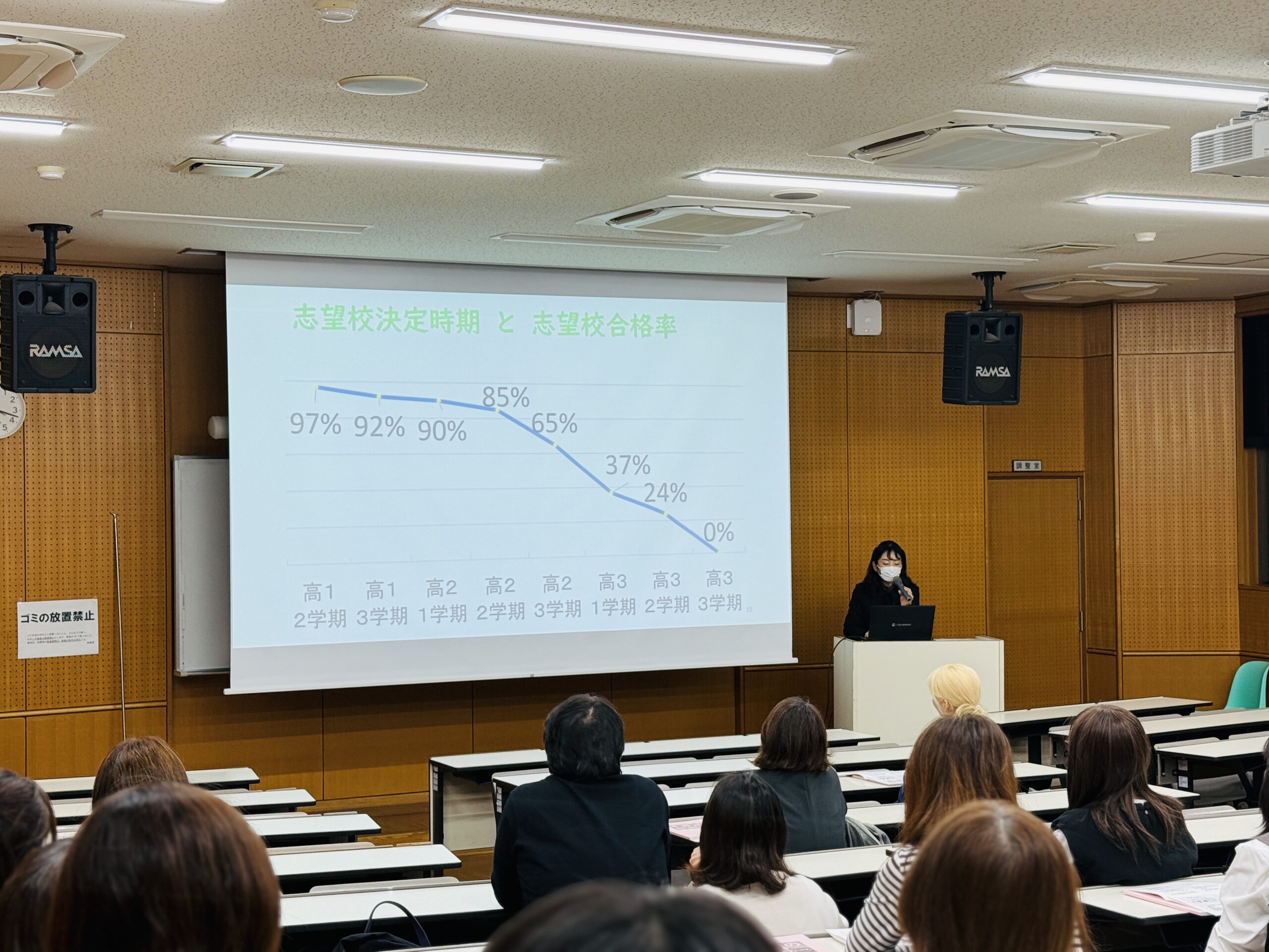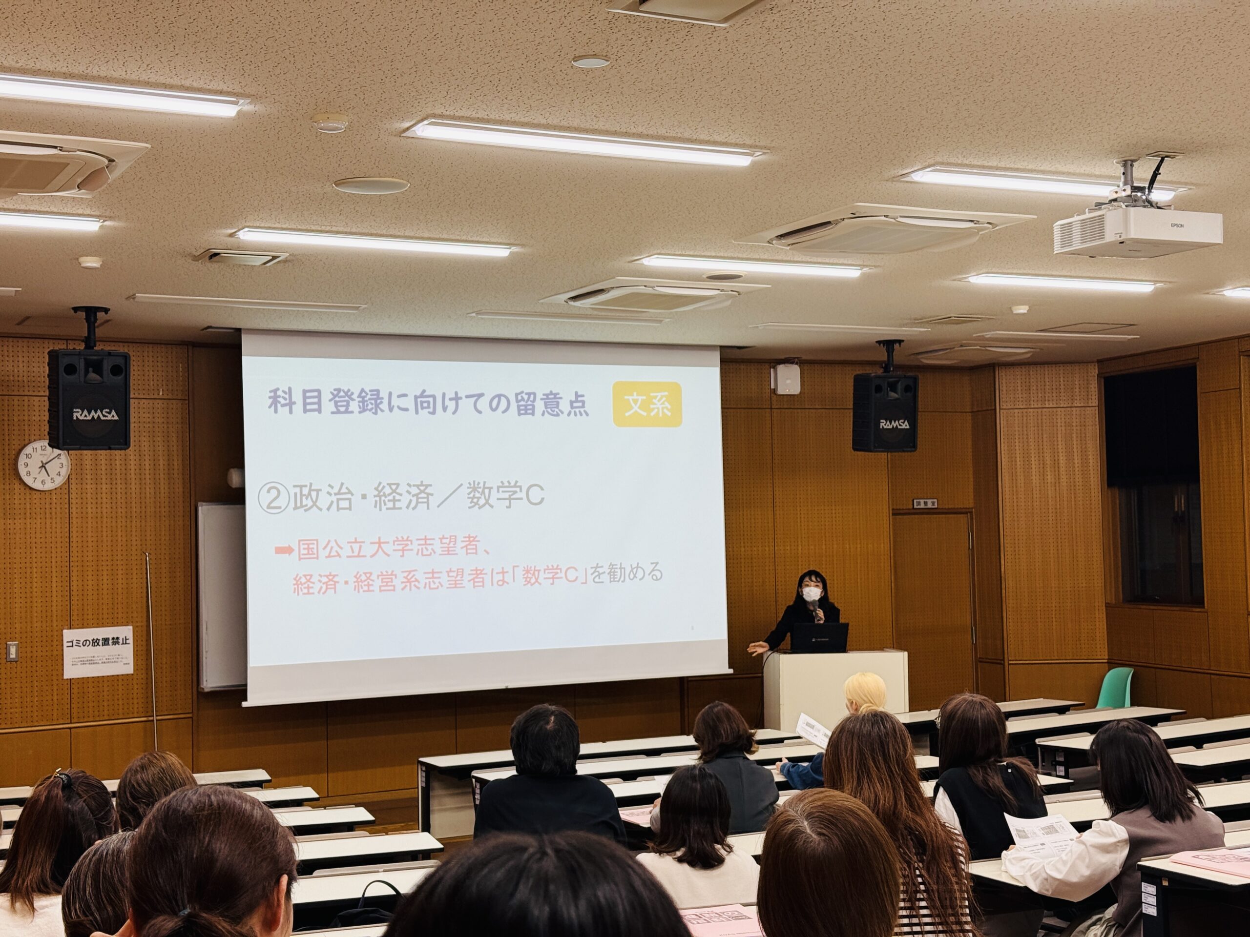 10月24日(金)に、特進BASICコース・進学コースの高校1年生の保護者向け進路説明会を実施しました。 アメリカ研修旅行も終了し、いよいよ希望の進路実現に向けて本格的な受験勉強が始まります。 保護者の皆さまにも、今後の取り組みの流れと趣旨をご理解いただくため、 各コース主任による進路実現に向けての進路説明会を行いました。 保護者の皆さまには、ご多用にもかかわらずお集りいただきましたこと御礼申し上げます。