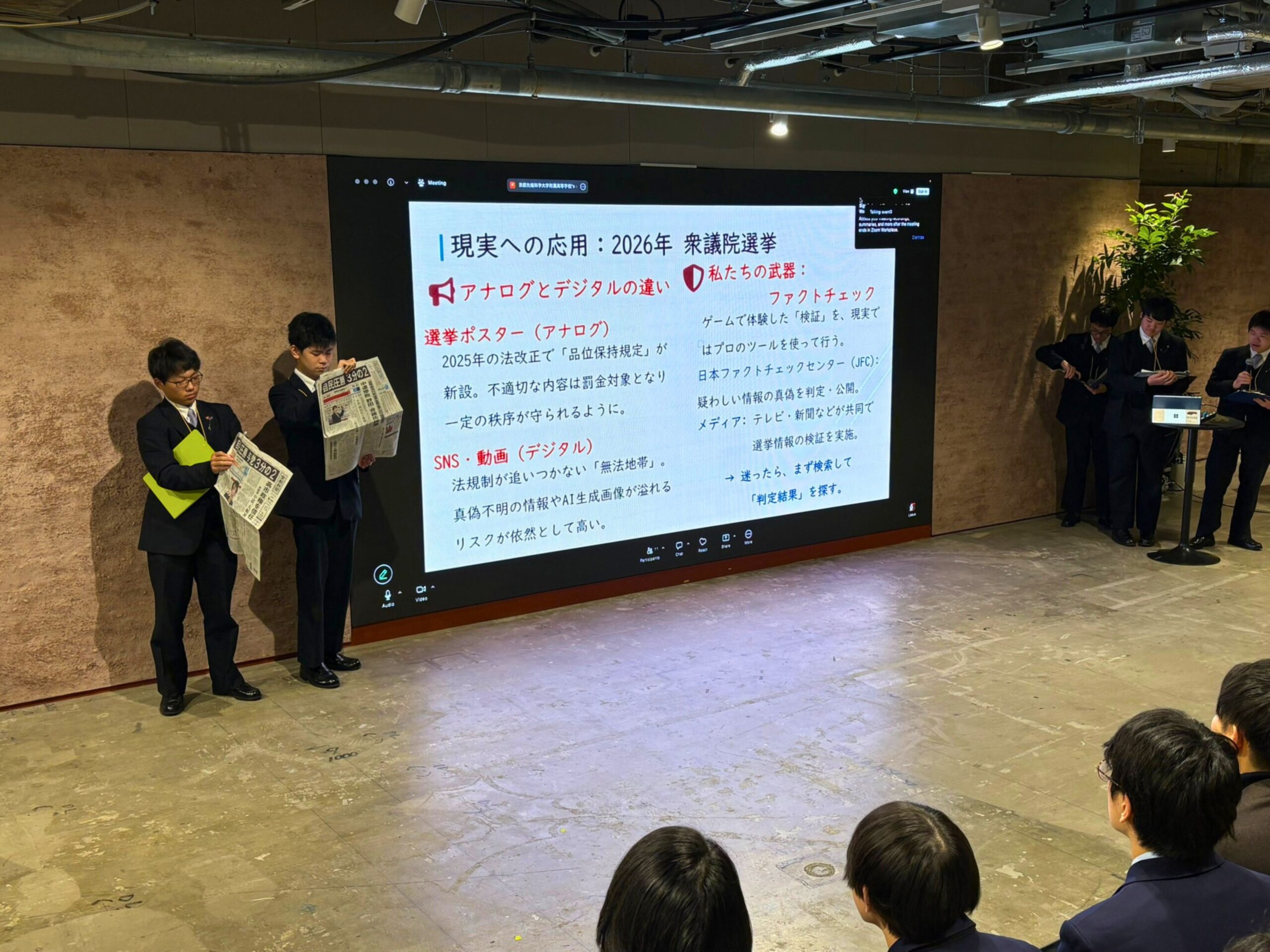 今回の発表は、選挙を「遠い出来事」ではなく、自分たちの未来と直結する課題として考える学びを社会に発信する機会となりました。本校では今後も、主権者として必要な判断力を育てる教育実践を大切にしていきます。